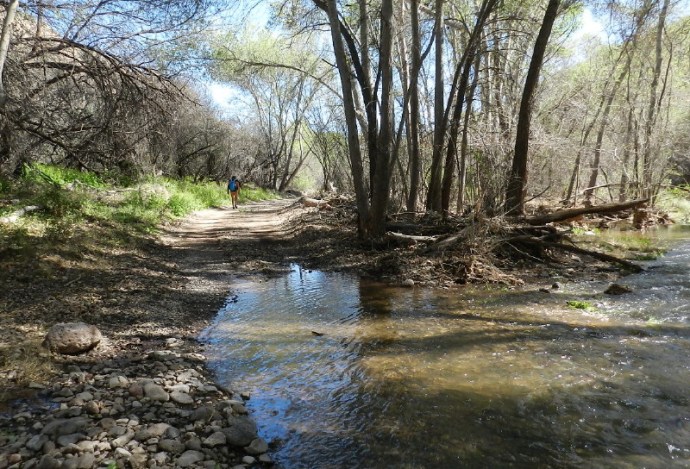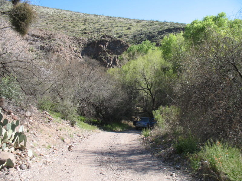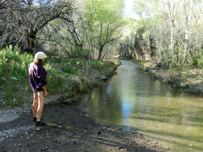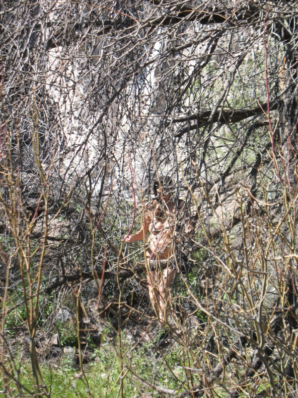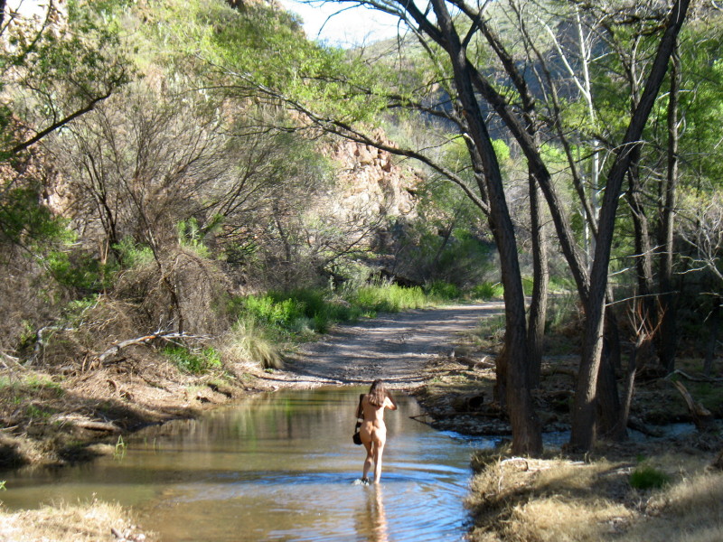 We are on a long straight stretch, listening to the creek and not able to hear much else, when we notice the sound of a truck behind us. Back down the trail, it quickly comes into view. We are caught, nude and natural in the middle of the road by the quick conveyance. There is just no time to get dressed. We stand on the side of the road to let it pass, my back to them and DF in front of me in an attempt to comply with Arizona State law. There are apparently two adults in the cab. Two kids, a boy and girl, are in the bed of the pickup. They pass with no remarkable expression and we just wave and smile. The kids appear unfazed.