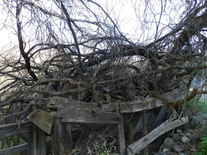 We gather at the truck and take photo opts as we find them. DF spots an old ruined chicken house which has been crushed by the mesquite tree’s branches growing over around and through it.