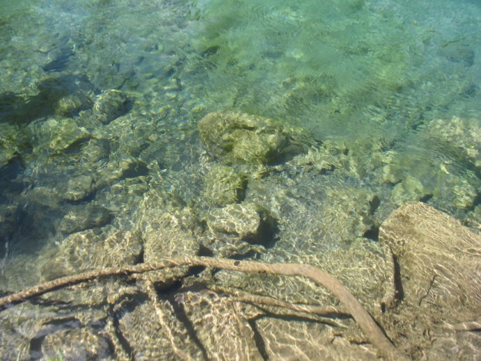 We find that it is as she described, a large swimmin’ hole with trees. By swimming across the pool, there is a small beach with some shade.