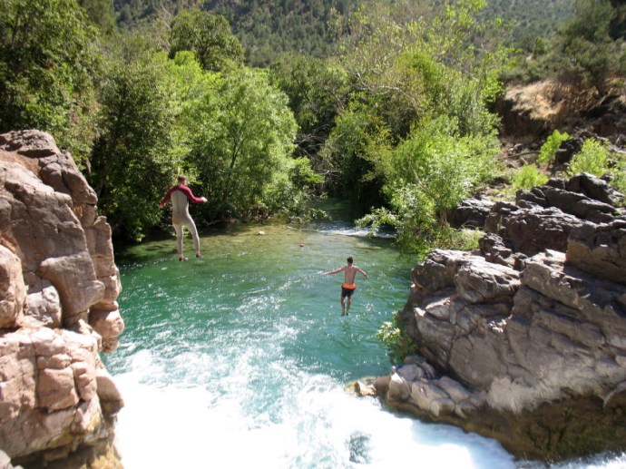 It is not long before we encounter a pair of young men in wet suits at a waterfall. “Are you gonna jump?”