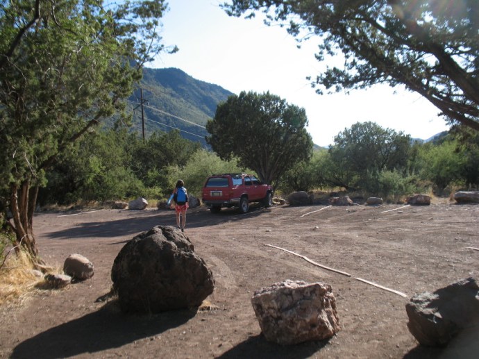 When we had left Tucson, there was apparently only one other car registered for the day. The other lots were empty on the way up, but when we drive to the last parking lot, it is nearly full! It is a trailhead to a waterfall about a mile or more upstream. Where did these people come from? This isn’t a spot for comfortably bare, us.