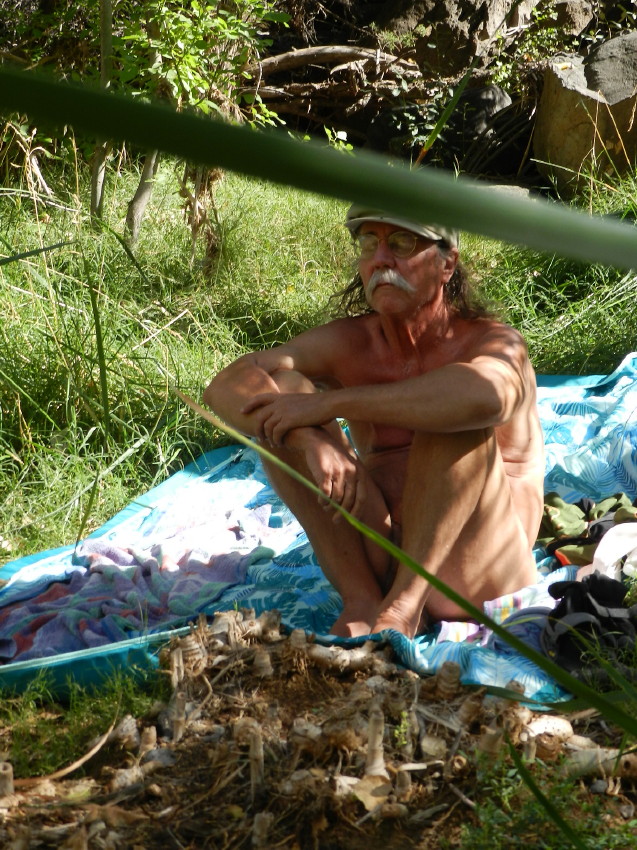 I have realized this morning, that if those neighbors see us, they will have to be looking pretty hard through a wall of brush and tree branches. They are more voyeurs than we are reckless, so as “a reasonable person may be offended” as the law states. We then take a more relaxed attitude, as we move around camp and load up.