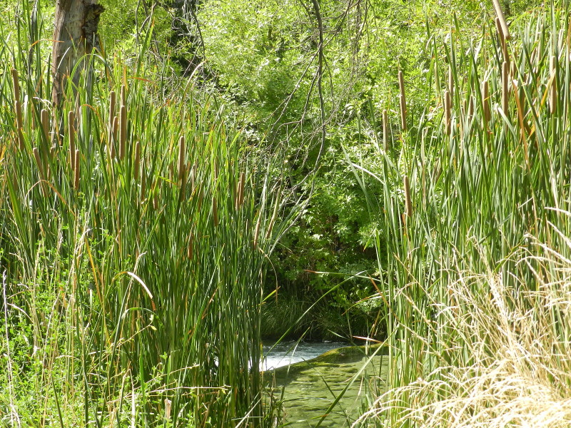Reeds grow thick along the stream. Water flows calm and then speeds off over short falls.