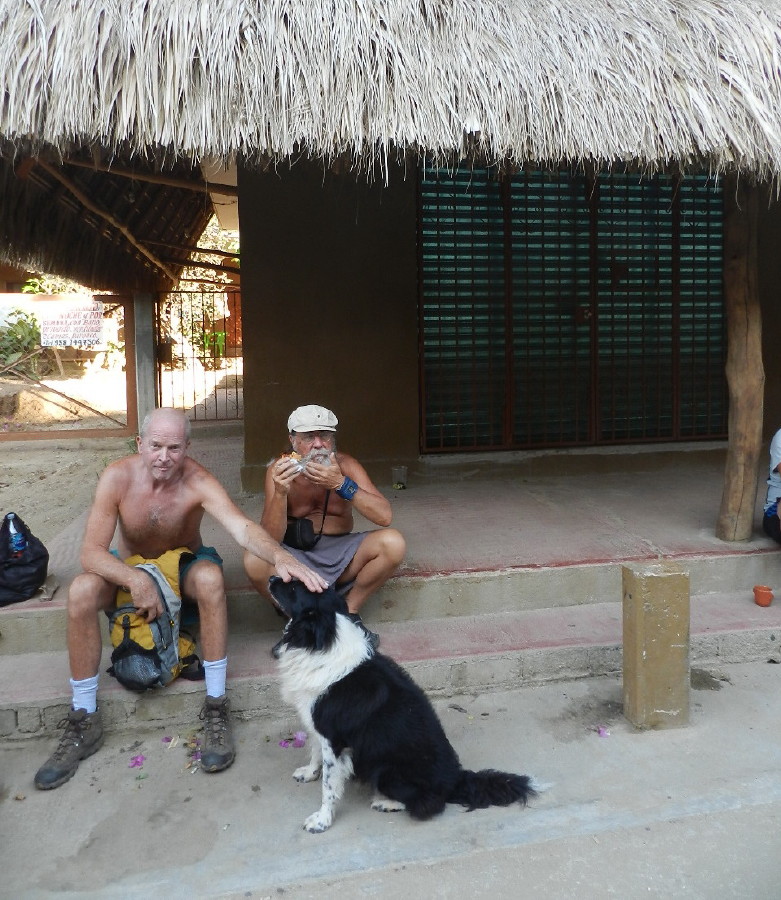 DF goes for a quick dip in the ocean. She wants to swim. The surf of Zipolite is often too rough for peaceful swimming. This beach is calmer. She has a tan thru swimsuit under her dress, but I’m left out with only a kilt and a shirt. Our friend has business and takes off, as I wait for her.