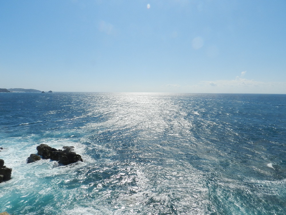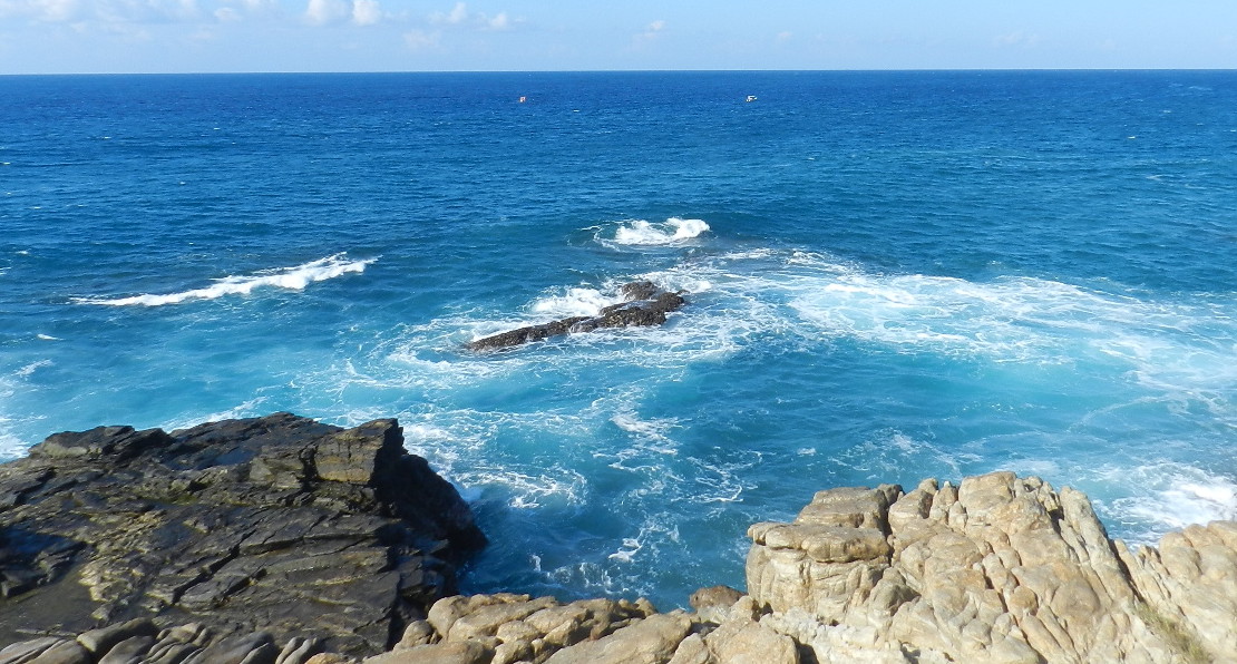 We round the point, watching the waves crashing below us into the jagged rock formations. Foam mixes with wondrous blue, as spray shoots thirty feet high.