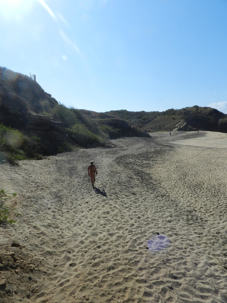 There are just a few small figures down on the vast beach, one with three dark triangles. This isn’t the freedom of the nude beach that we have spent the last week on. We will get undressed, but only in stealth. We even discover a sign on our way out of the preserve declaring “no nudista.” Obviously, there are more free ranging people here, emboldened by our nude tolerant beach. There will be few up here, however.