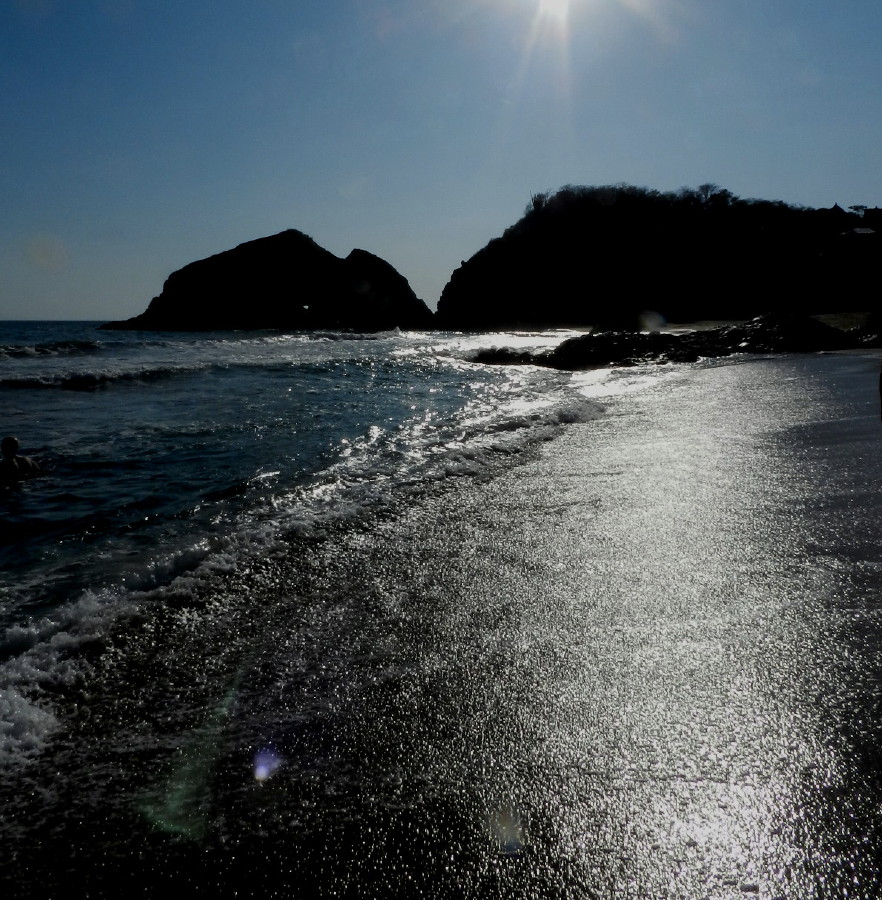 This smaller beach is a cove. The hillside is populated by thatch roofs of palm leaves. We come to the end, a rock wall there. On the other side it is being pummeled by white foam. Water shoots up ten and twenty feet, wraps around the outcrop and slaps down on the beach. From there, the waves roll out like carpet rushing towards us.
