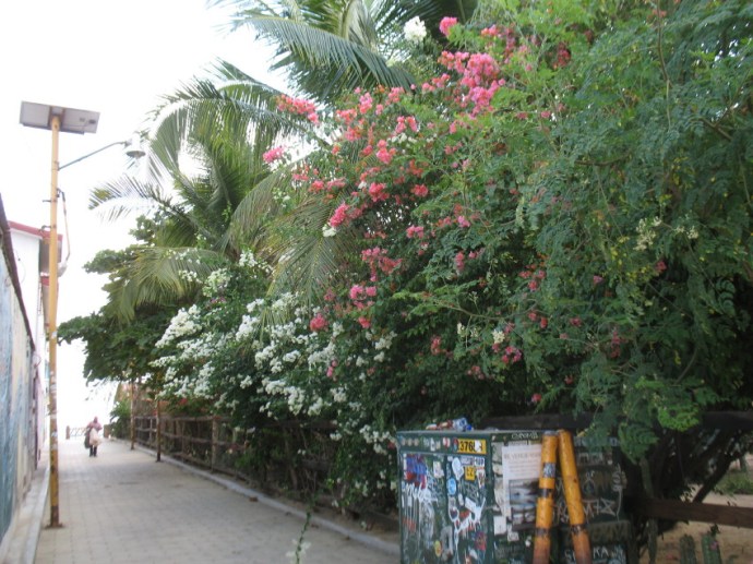 It has been a longer meal, a savored meal. The preparation and the usual pace have caused us to miss most of the sunset, but we’ll still get enough of it, watching naked from the beach. We stroll down an alley for the beach again.