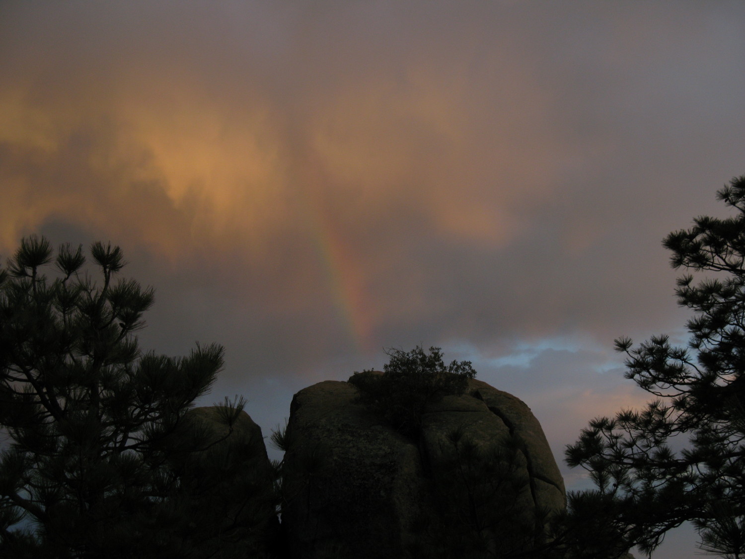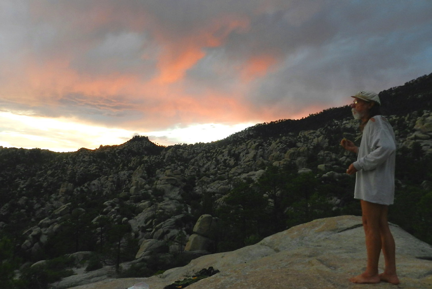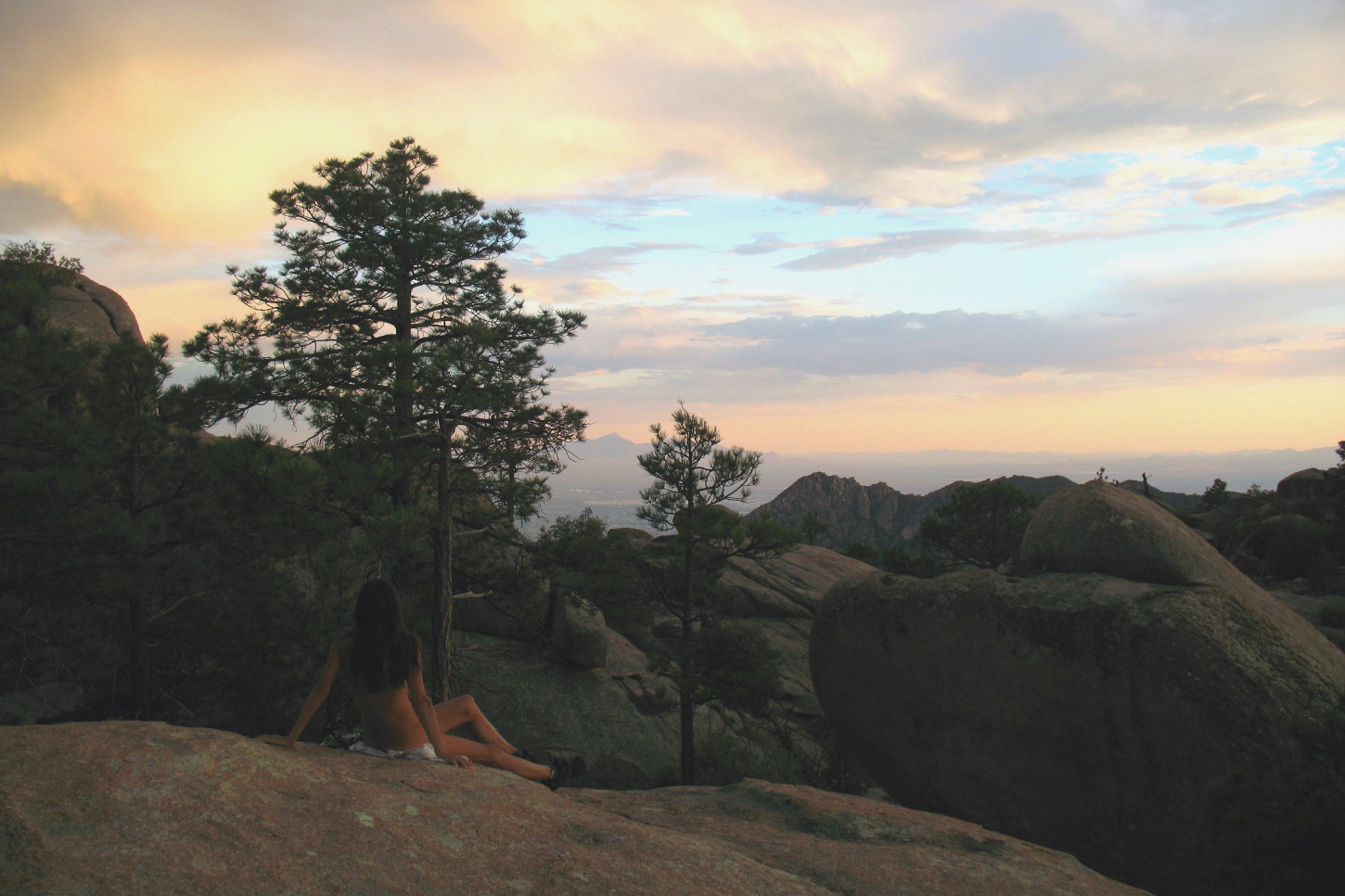 There is still some overcast in the constantly changing skies. It is keeping the heat in. The granite surfaces are retaining the radiating heat of the day. It is a warm evening, just perfect for an absolutely nude existence. Everything is easy to walk on, if I just watch out for the little errant pine-cones scattered about on the occasional collection of a fluffy bedding of long flexible needles.