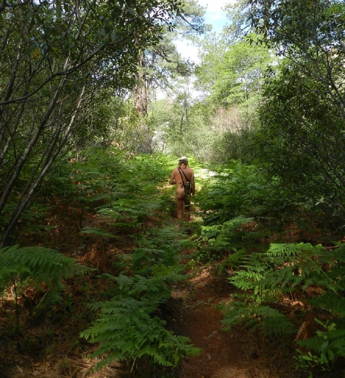 We make our way through the trail-side campsites. Tall soft ferns in the cool shadows tickle our nude bodies from head to foot.