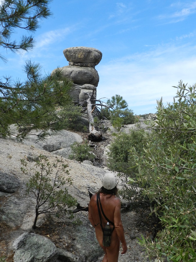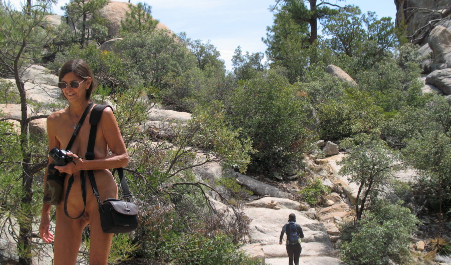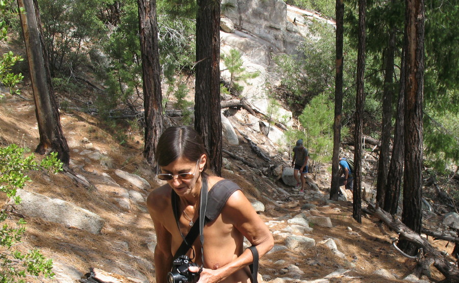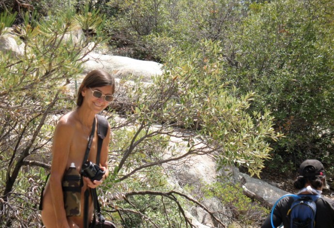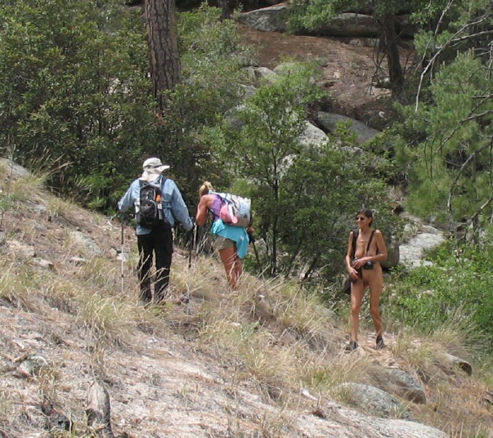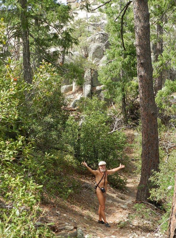They are heading to the Lemmon Pools. I slip down the big sheet of bedrock granite in pursuit. I’m still barefoot all over. We decided to stay that way. Naturist freedom is, after all, a major reason to be here.