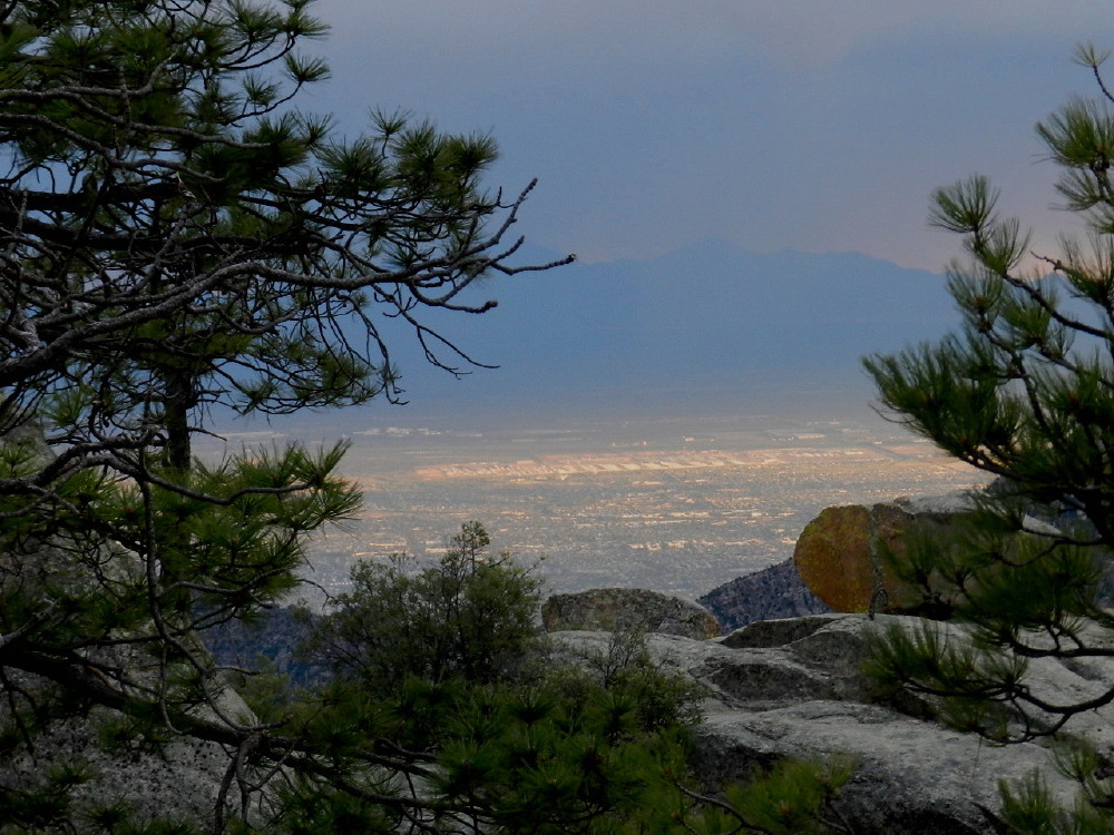 After we laid down in the cozy tent, there had been voices in the night,. Over at the grove of pine trees, the loud campers had come to look at the city lights. Up here a mile and a half higher than the city below to the south, it is a notable sight. The grid of bright colors contrasts with the dark night, glowing and sparkling as it fans out across the valley. The sight looks as if sitting in an aircraft, but it is calm and quiet, looking out from these rocks. We could be floating nude on a carpet in the sky.
