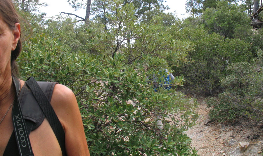 I follow them, which leads me to a trail along more rock, pines and manzanita brush. There is a wall on my left. To my right is a drop into the creek’s canyon, which is filled with fallen boulders.