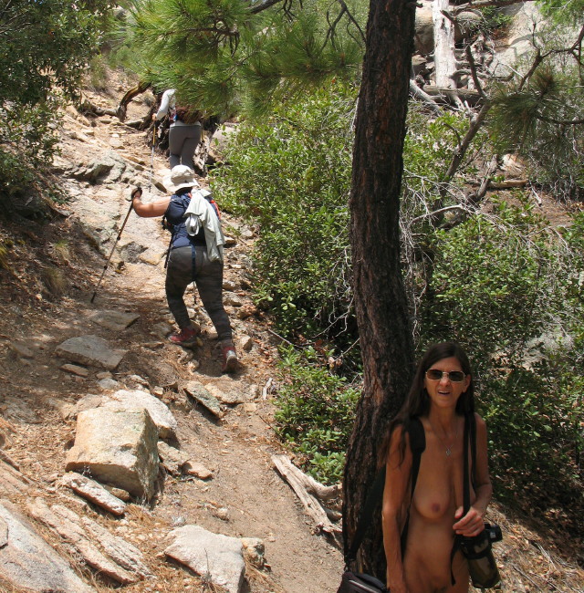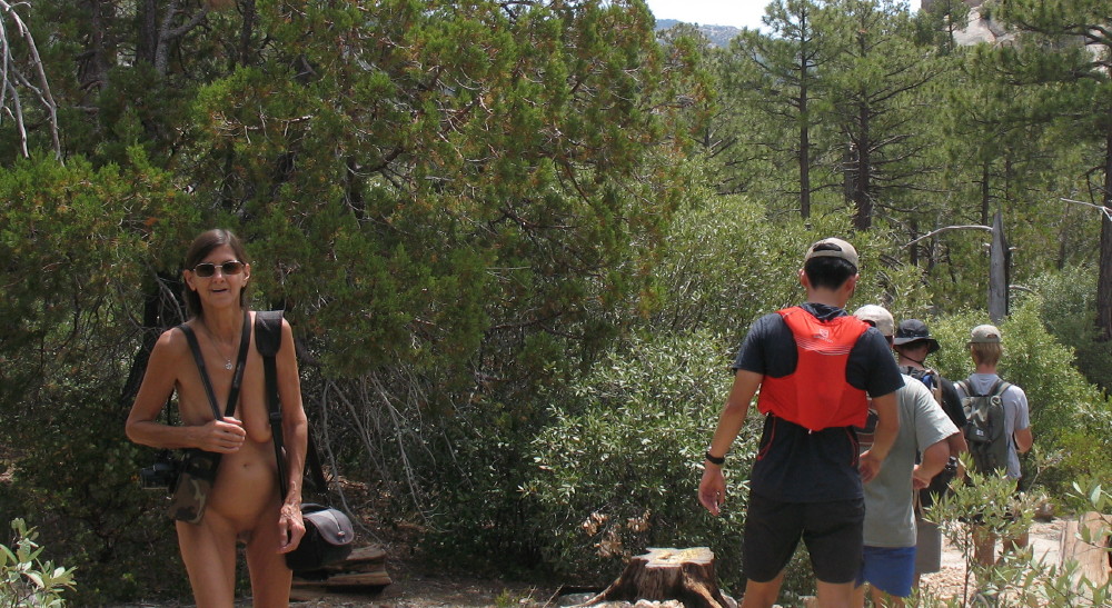 Most don’t seem to even notice our inadvertent public nudity. Many are looking down at their careful next steps. Many just smile, or say hello. Everyone is more interested in maintaining social distancing of six feet than the nakers in their midst. A group of runners pull their masks up as they zip by. One couple going up a hill doesn’t even notice us sitting on a rock watching them a few feet off of the trail.