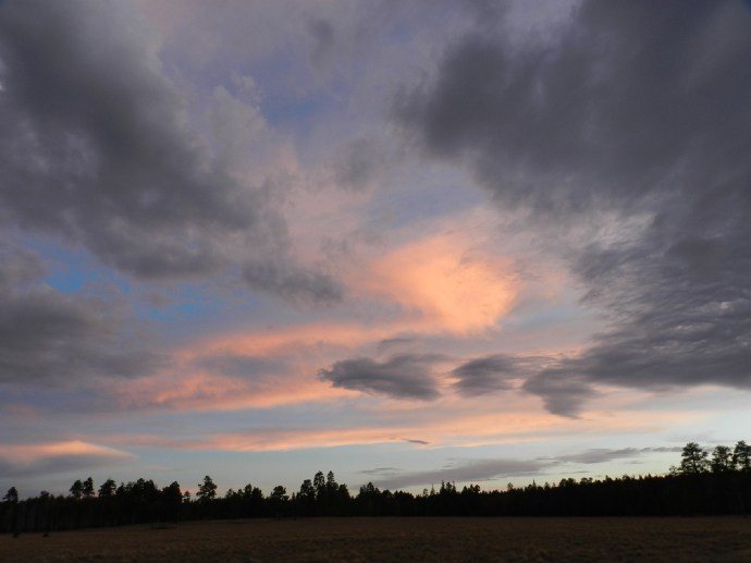 We stand in awe, turning around slowly. Even out to the east the clouds are now illuminated in pastel colors.