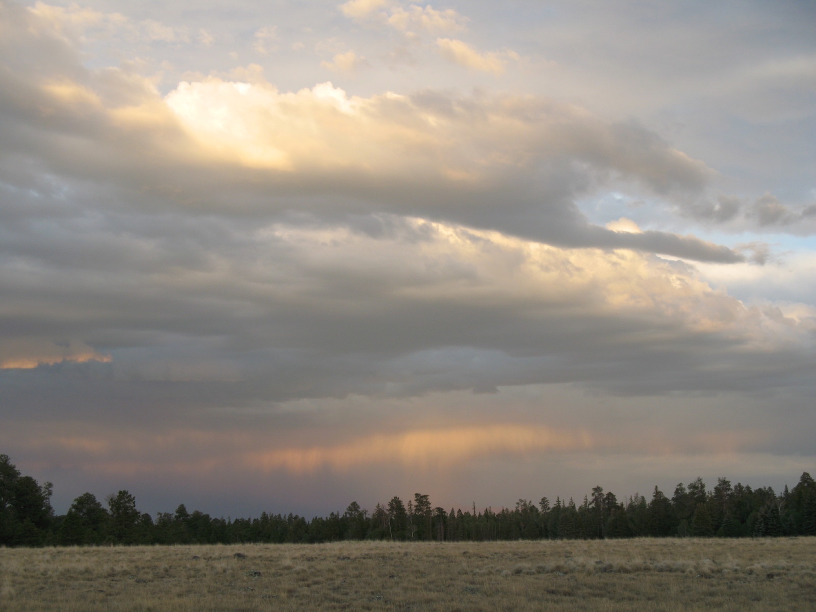 It is sunset time, the exciting time for the sky. We are sitting on the top of a mountain arena. It is flat at 10,000 feet. It is the highest spot, save a few surrounding hills. This dome has a vast field on it amongst a deep forest.