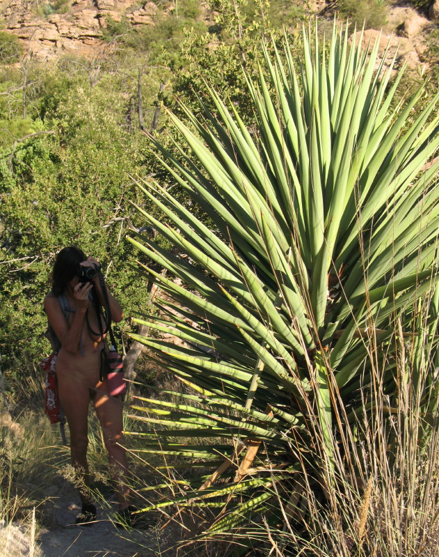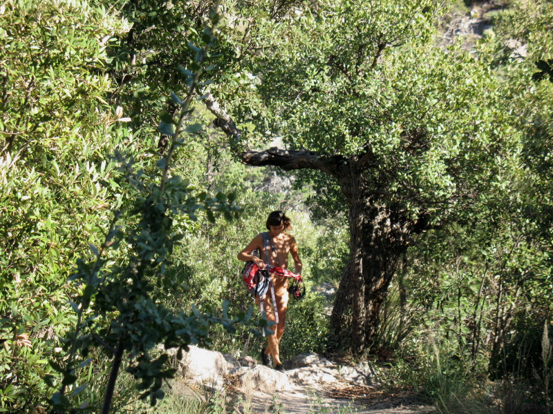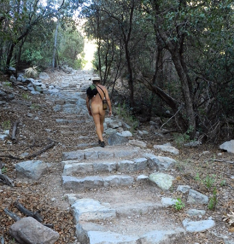The perfect air is not monotonous. As we pass through the spots where water will flow when it rains, the small gullies give is a cooling. The cool air flows like water in a creek bed downhill, cutting through thicker vegetation. None of this sensation and delight can be had with clothing on. We savor our body’s freedom and sensuality.