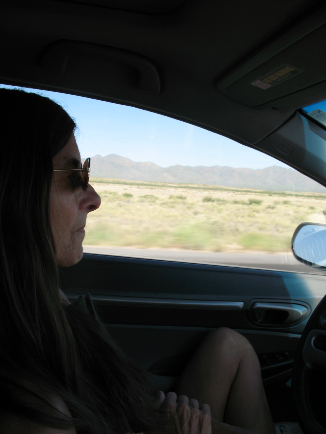 DF has been the driver and announces that she requires a pit stop. We decided not to hassle with dressing and public places back in Wilcox. She chooses a place to pull off quickly. It may be the least advantageous spot along the highway. There is a blind hill in front of us, a bush hides the view the other direction, making for a potential for surprises. Maybe we’ll hear any coming vehicle. The car is even parked on an angle so that the doors are of little use to hide behind.