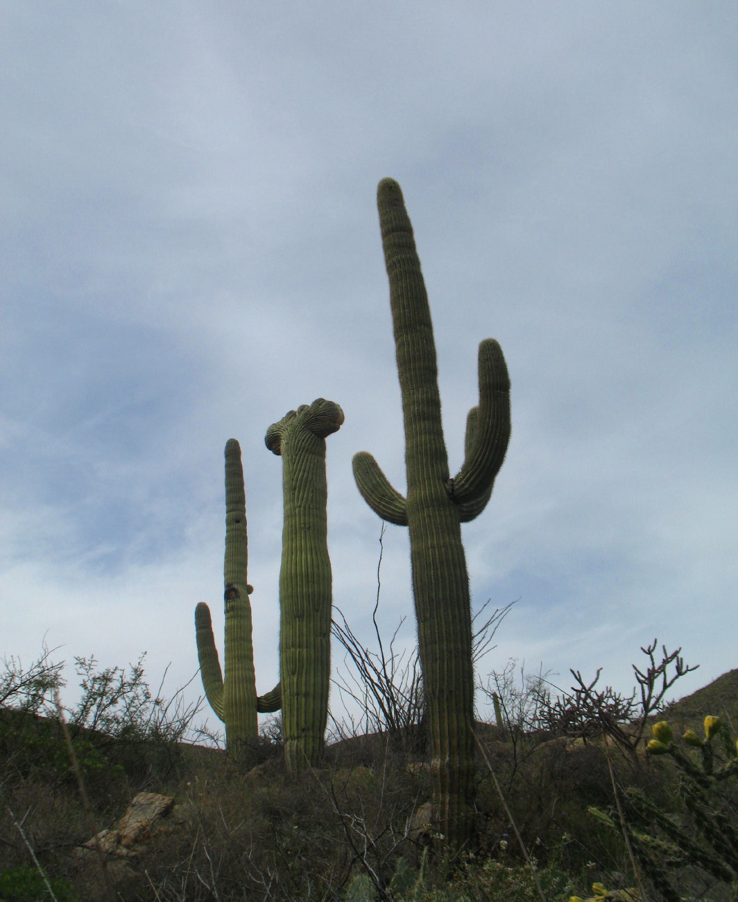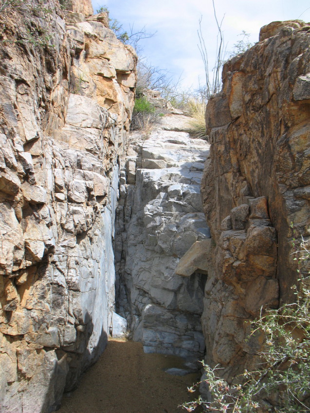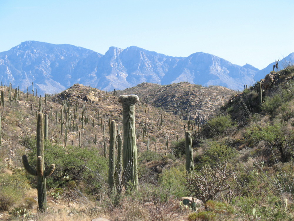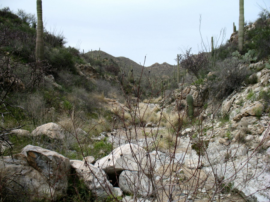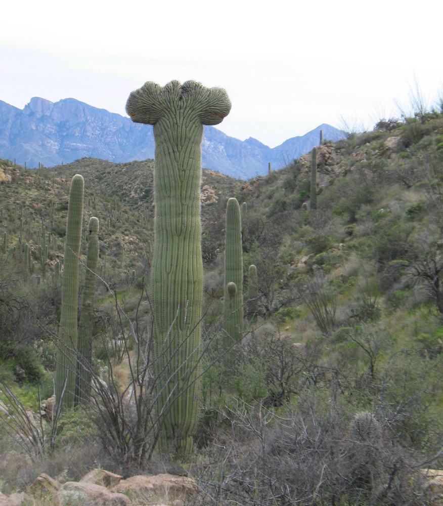 There was a mature crested saguaro up a channel in a small canyon that I’m passing. I remember smelling the scent of fresh meat as a predator snacked there years before. I decide not to trouble myself, today. I want to see how the younger saguaro is coming along.