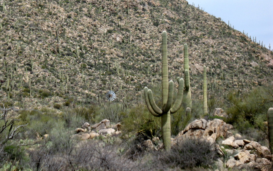 I climb on the steep rock, careful not to get poked by the overgrown mesquite branches that have taken over. I have changed plans on a whim. I’ve decided to not search out the ancient Native American petroglyphs, instead, I’ll go to the old windmill that will show itself as a landmark I the vicinity of where this wash begins. I’ll continue on, to capture an image to chronicle the growth of a budding crested saguaro that I discovered a few years back.