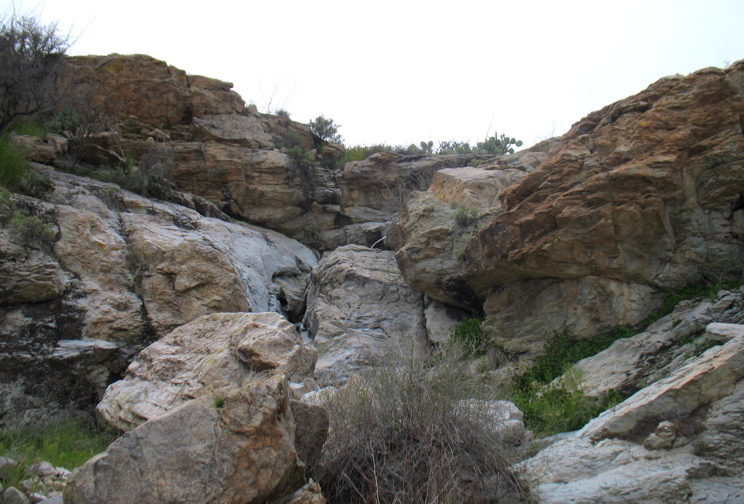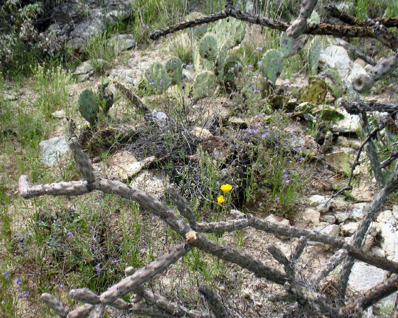 Perhaps the stack of rocks marking my intended route was taken, or buried under the thick desert shrubbery grown from the winter rains. The hills are not as familiar anymore, partly from lost memory, but mostly the change in vegetation. Rain makes things different. Lots of rain makes things lots different.