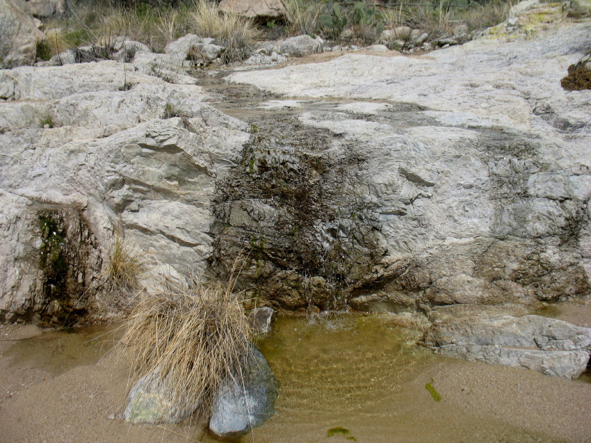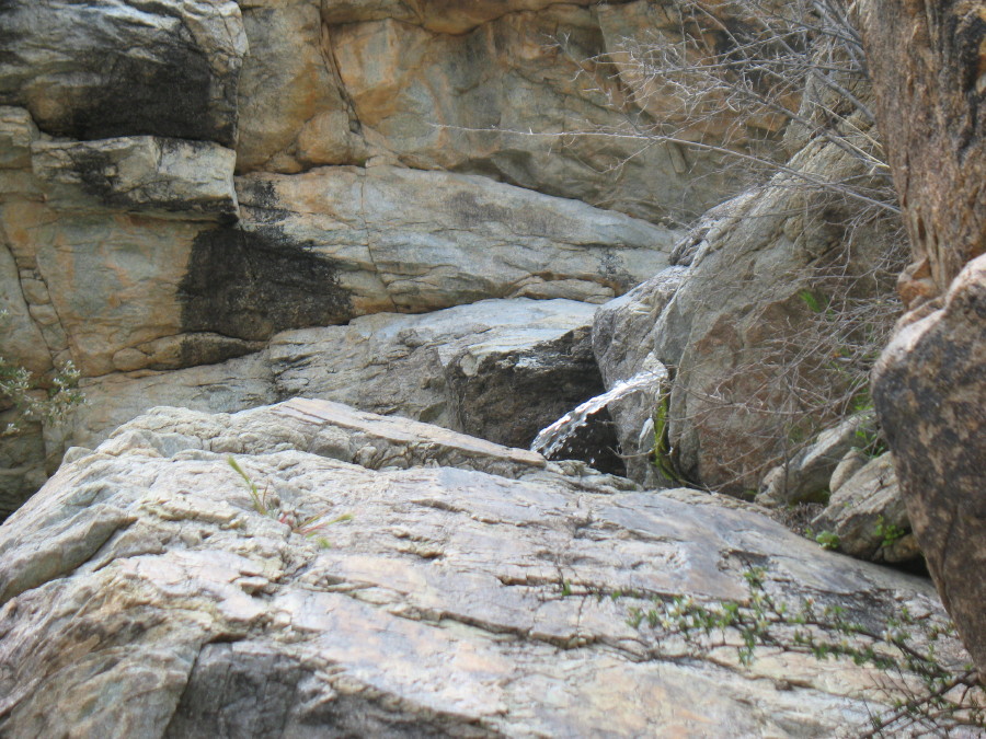 At the base of a waterfall, my foot sinks deeper. It is very soggy here. I must climb carefully around this, along the edge of the bedrock, or I’ll sink in like quicksand. Usually, there is about a bucket full of water at these places, but more of the rain’s flooding has placed more sand here and it is more saturated than usual.