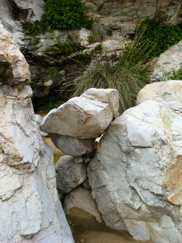 There had been quite a flow here previously. An egg of granite at two feet in diameter is lodged in between two large boulders waist high. It had been lifted by the strength of the current.