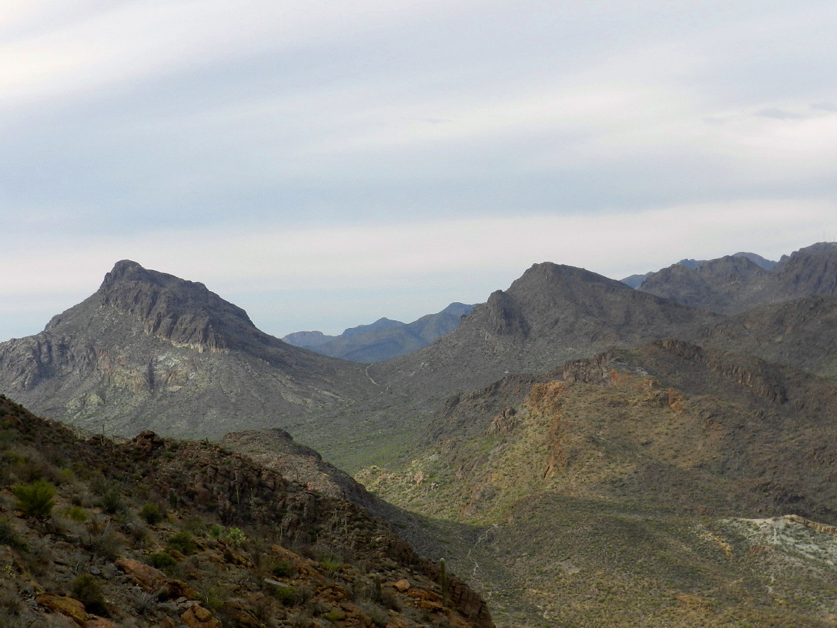 We take few breaks. When we do, we turn and capture a picture of the magnificent vistas that we view from this height. In the distance, the Catalina’s are northwest, the Rincon’s to the east, the Santa Rita’s southeast and each have a white cap of snow on them.