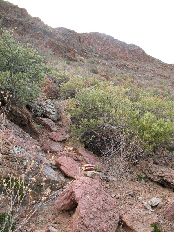 The trail zigs around the occasional leafy jajoba bush, a particularly tall rock step, or a menacing bundle of needles. If it wasn’t for the cairns, we would be disgusted and lost. The vegetation grows taller and thicker when we get to the higher elevation.