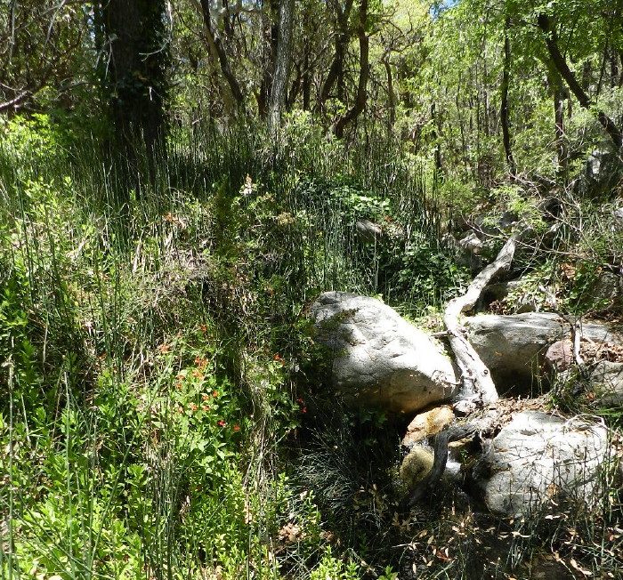 “Enchanting” forest gives way to “magical.” There is a waterfall and ponding. There, the stream-bed widens and a collection of reeds, grasses, flowers and other lush vegetation displays itself.