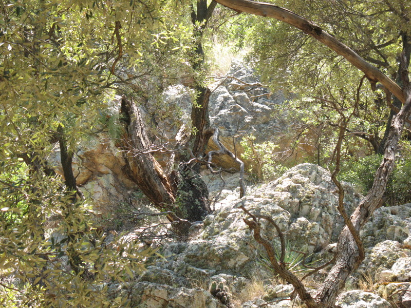 We sit relaxed under the canopy of scrub oak, alligator juniper and other associate beings. DF pulls lunch out of the cooler, a stack of sandwiches made the night before. This place feels good. The sounds and quiet are peaceful and we have it all to ourselves. We’ll wait to have a hike a bit later.