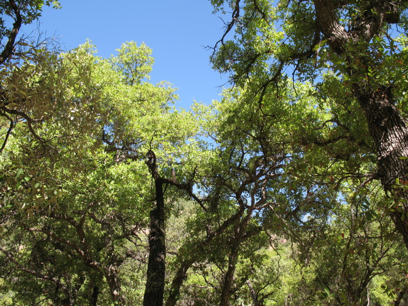Still the sound of crunchy dry leaves persists. In my disturbance to the quiet forest, I look up at black gnarly bark going every which way amongst various tones of green florescence.