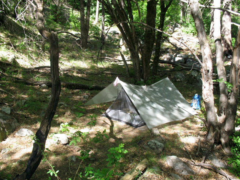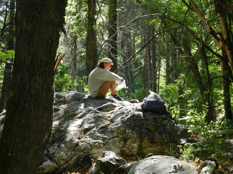 From about here, it is two miles uphill with plenty of distractions along the way. We are in a designated wilderness. We can leave our little home away from home alone in this forest. It is open, covered with the tarp and the mesh bug net under. I take the other pack and fluff the down camping quilt. I make it look like someone is napping in the solitude and shade.