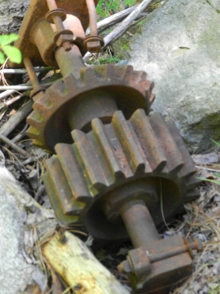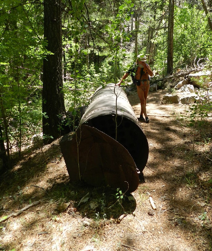 I begin to walk off the trail. She tells me that I have missed a switchback in concern. I smile and wave, curling my finger to her, the signing to follow. I watch her face light up as she notices a huge rusty steel tube. It is a boiler for the old mill.