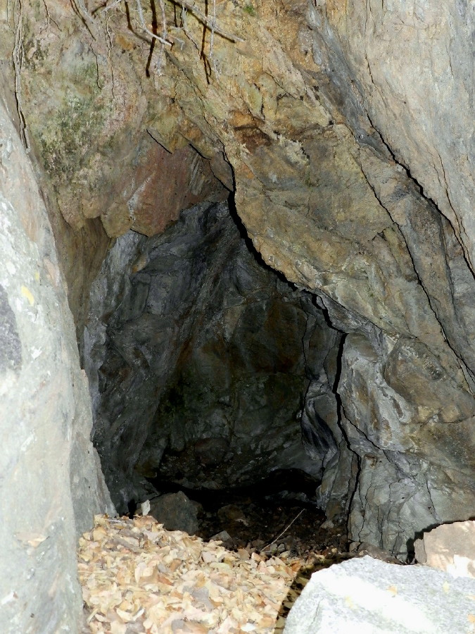I pass one mine, missing it, as I keep my vision downward at footing on the rough trail before me. She calls me back. It is like a scene from Arabian nights. A large boulder looks as though it has been magically rolled away from the entrance of a cave. She climbs up and looks inside.