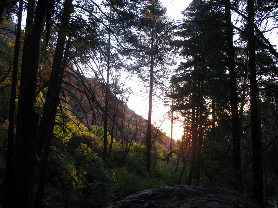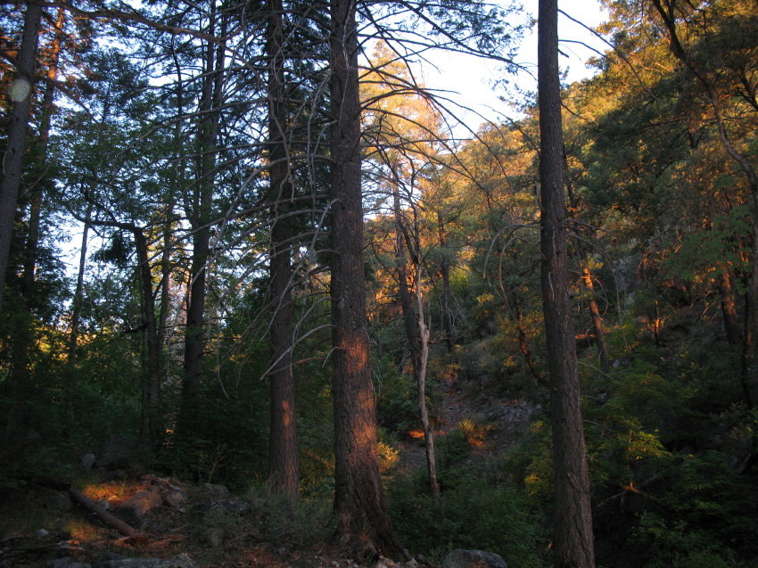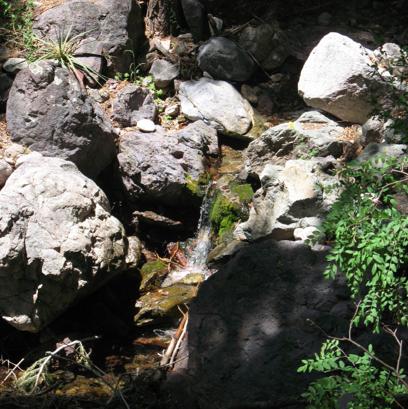 We come to the fork marking the choice of two journeys and take the unknown, newer path. The old trail had been washed out by the floods which followed the fires several years ago. The old wide road to a mill (Miller Canyon) has been replaced by a thinner trail, which wanders above, but aside the steep canyon stream below. We hear water rolling and catch glimpses of heavenly little falls in rock and moss.