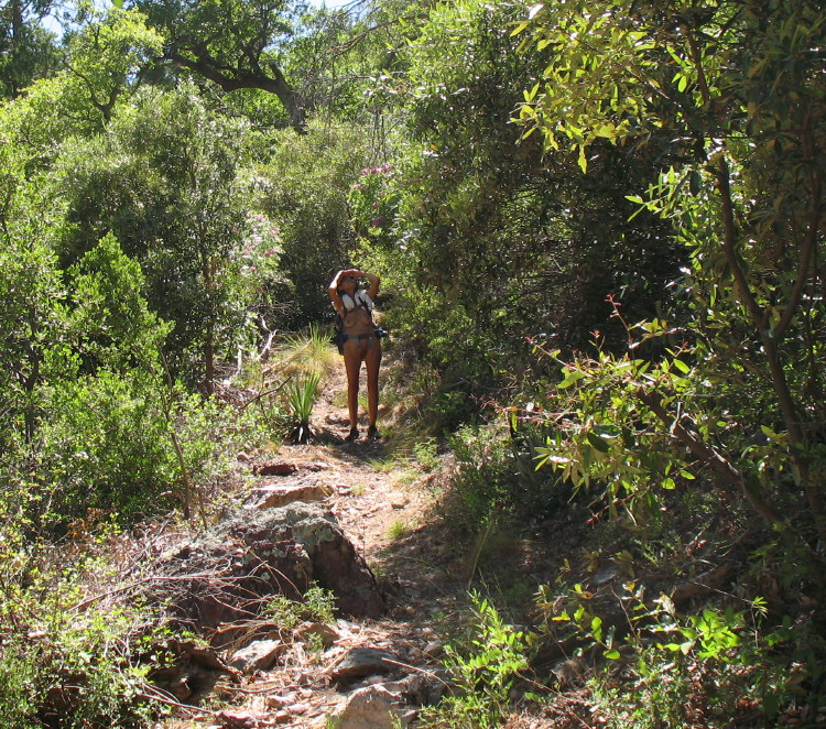 We stuff some light clothing into the daypack, just in case the wind picks up at the more open, higher elevations and chills us. DF has volunteered the backpack duty and wears a very thin beach covering for her shoulders with a short dress that may have been meant to be just a top. I’m up for nudity. The weather is continuing to be in right the range of just perfect.