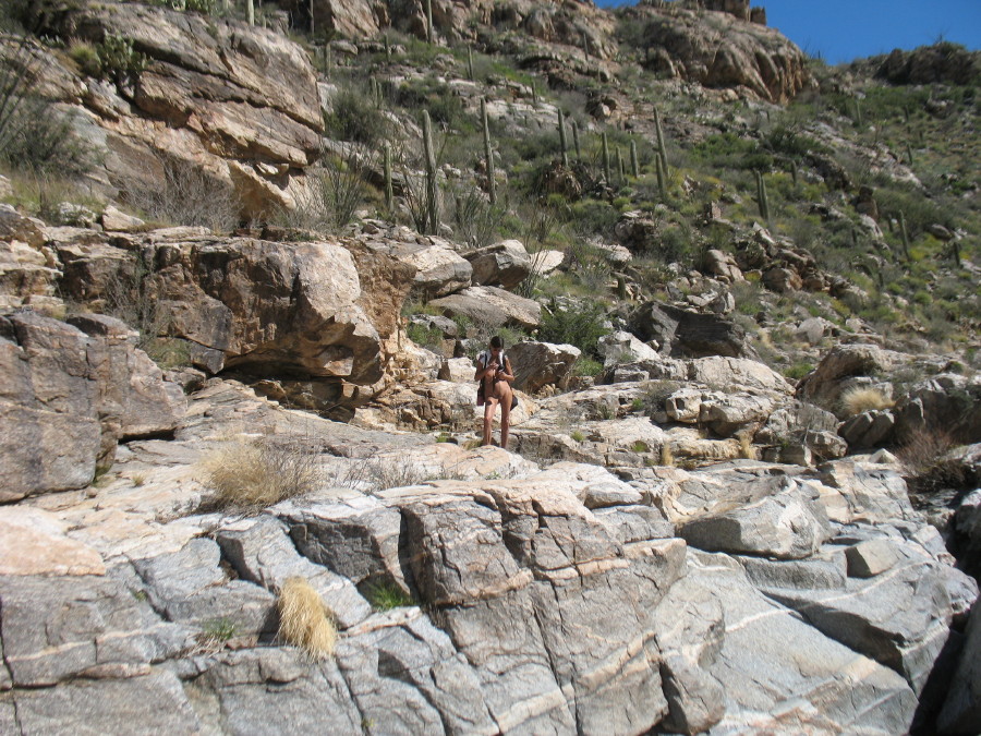 I see a friend, a regular user of the canyon and jump over the crevice between the slabs of granite, to greet him. We talk about the actions of the Forest Service and any threats to nude activities in the canyon. He keeps throwing his frizbee into the water to keep one of his dogs occupied. The young one, just a pup, wants to jump up on his bare skin with its claws. It’s ignoring any inclination to behave. This is a fun place.
