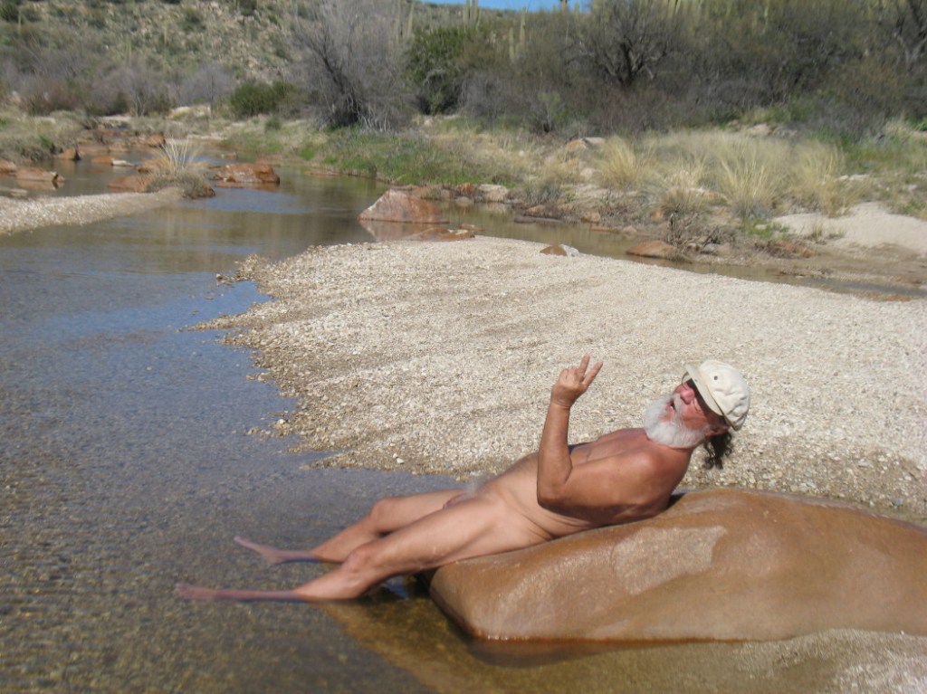 At the flood warning sign, I stuff my coverings into the backpack. I noticed that someone has painted over the clothing optional information, but one of the naturists who use the area have already painted over that. I don’t think that the Forest Service painted over it. It is probably the “Friends of Redington Pass.” They recently had a clean up. They would treat the announcement of nude recreation as graffiti.