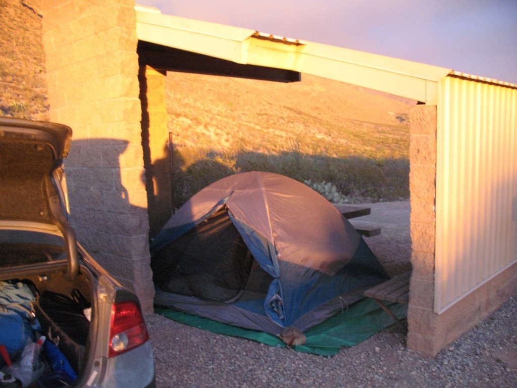 There are numerous adobe picnic shelters spaced across this hillside. I find a space under one that is just big enough for the tent. If my weather research is proved wrong, this will be an additional insurance.