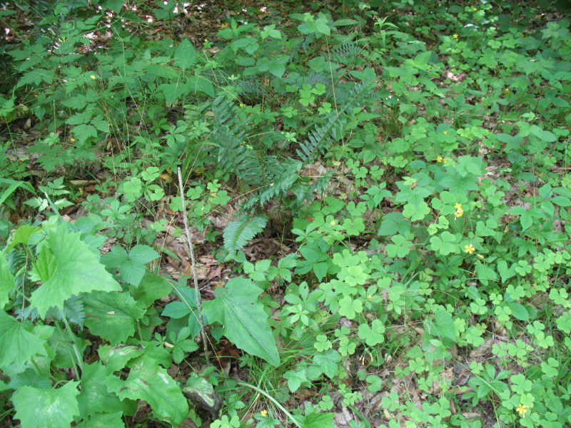 Here the leaves hold thick slimy mud between them. My bare feet get a coating, even between the toes. I suspect that it could be a spring seeping out of the hillside.