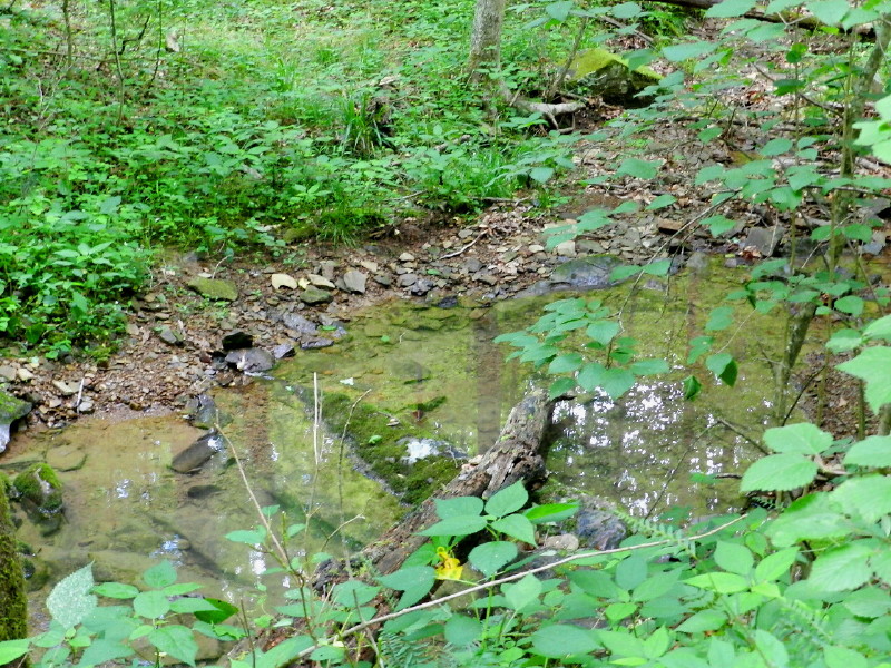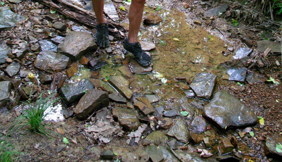 The trail is crossed by the stream. There is mud across the trail to step around.