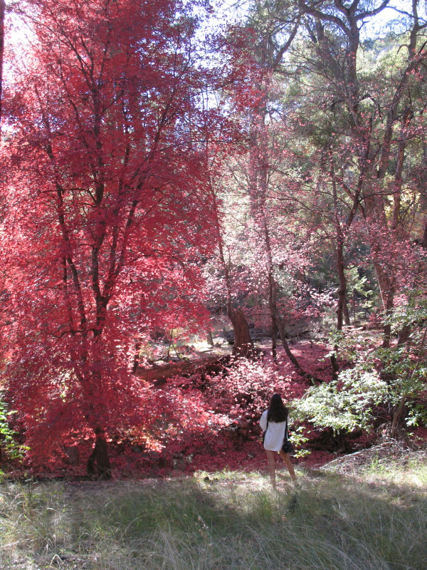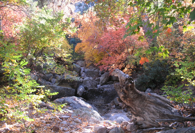 I have heard of this event and waited two years to get here. We have three days here, mid-week. There will probably be few other visitors to this remote canyon in a little known mountain range. I got a report last week that the colorful show was returning and it should be at its peak. The temperatures have been unusually high and sunny in Tucson this year. At this altitude, we are expecting to enjoy highs of mid- 70F’s. Our Fall leaf viewing won’t be bundled up in the usual warm clothing; it will be perfect naked weather.