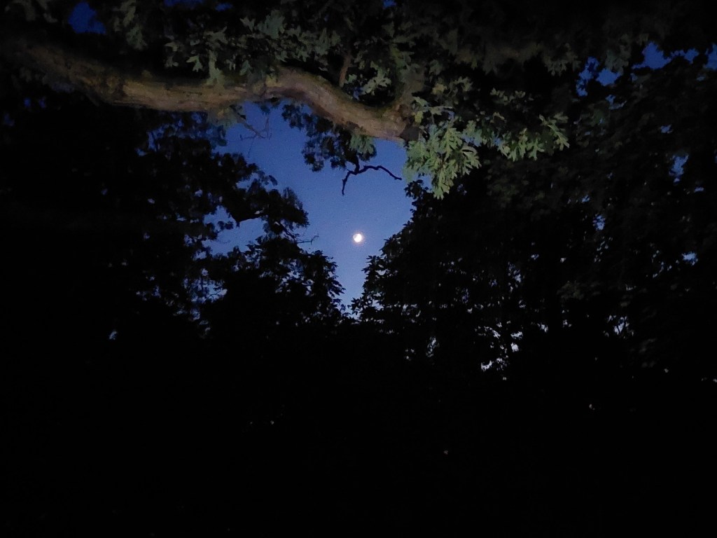 People turn in after the sunset in the quiet little town. Late, I take a pleasant nude walk and eventually visit a tree and stand looking at the moon.