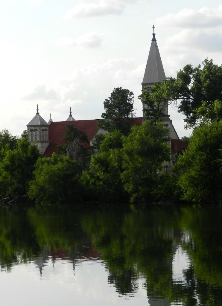 There is an honor system style box and a few trailers lined up by a calm river. Huge cottonwood trees run along the thick grass lined banks. Across the way there is a medieval looking church.