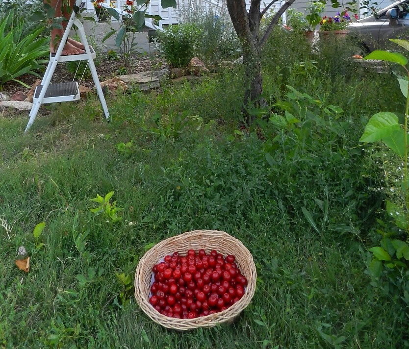 We visit with old friend in Denver that DF used to work with. Formerly a psychologist, these days, she is into good eating and organic landscaping. Out in front of her home, there is a cherry tree and it is loaded. We are invited and readily accept the invitation to pick these cherries.