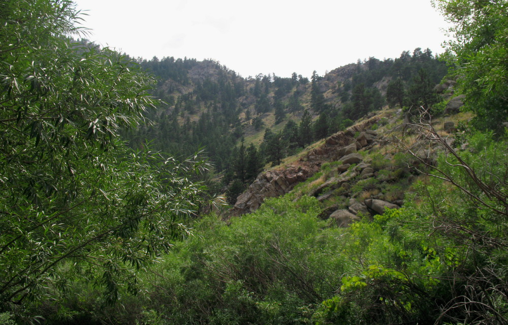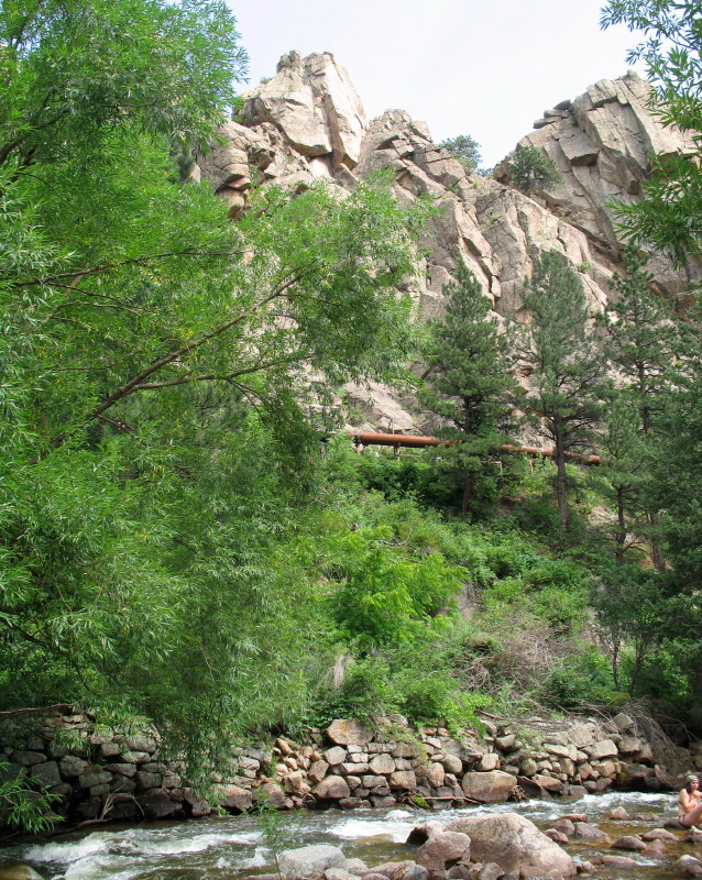 Steep walls of the canyon encase water, which is flowing like rapids in the river rock creek. That’s why it is called Boulder Creek, I suppose.