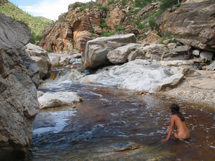 Their roar is echoing on the steep dark grey granite walls in this narrow stretch. It is often very windy here. A Bernoulli’s tube effect can push air at incredible speeds. Today, in the sun and triple digit heat, there is a pleasant cooling breeze greeting us across our nude bodies.