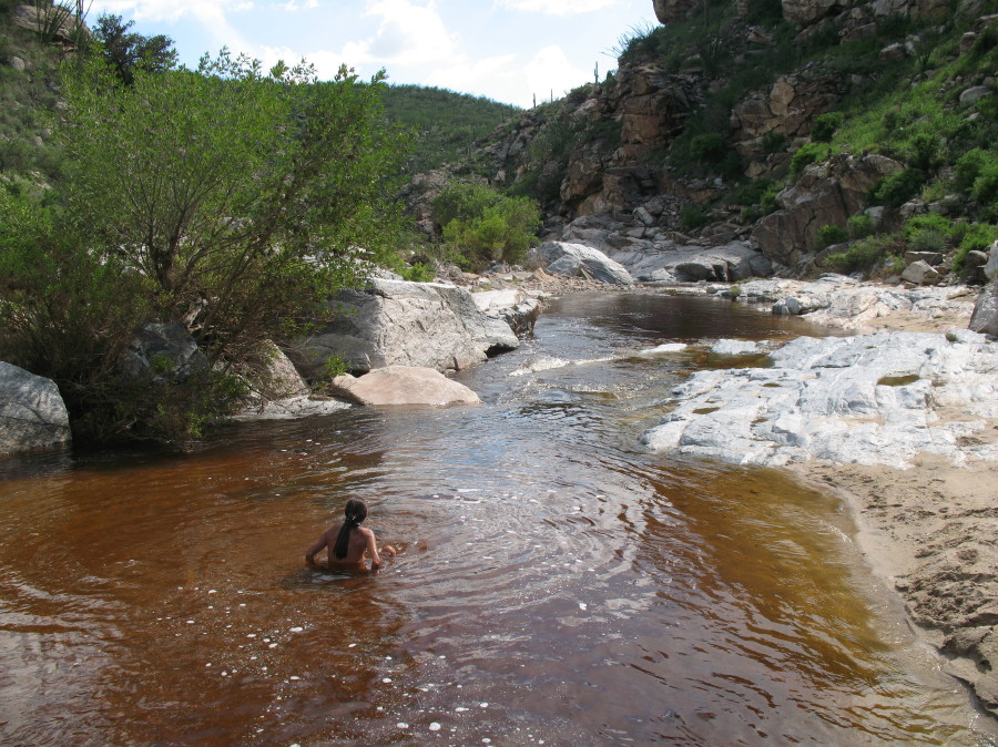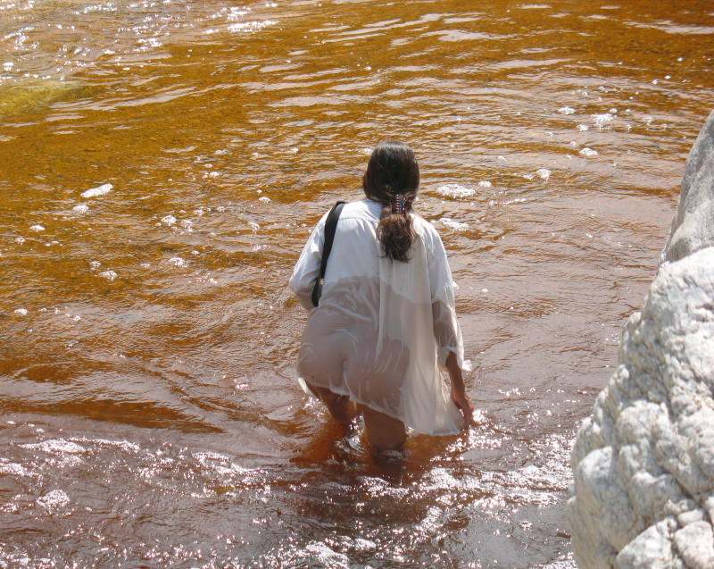 I get in the suds to cross over to the shade, planning to lay out on a rock, after a snack. I have pulled off my shoes to explore more naturally.