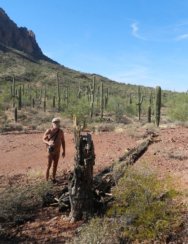We’re here to explore. We bushwhack over to it. A fallen tall saguaro is decomposing, leaving a long trail of debris.